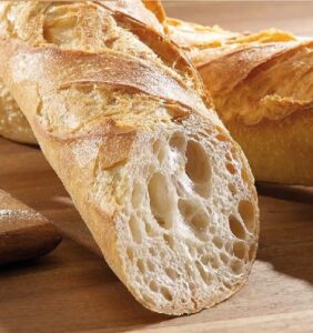 A baguette is a long, thin type of bread of French origin that is commonly made from basic lean dough. It is distinguishable by its length and crisp crust. A baguette has a diameter of about 5 to 6 centimetres and a usual length of about 65 cm, although a baguette can be up to 1 m long. : 263 kcal (1101 kJ)